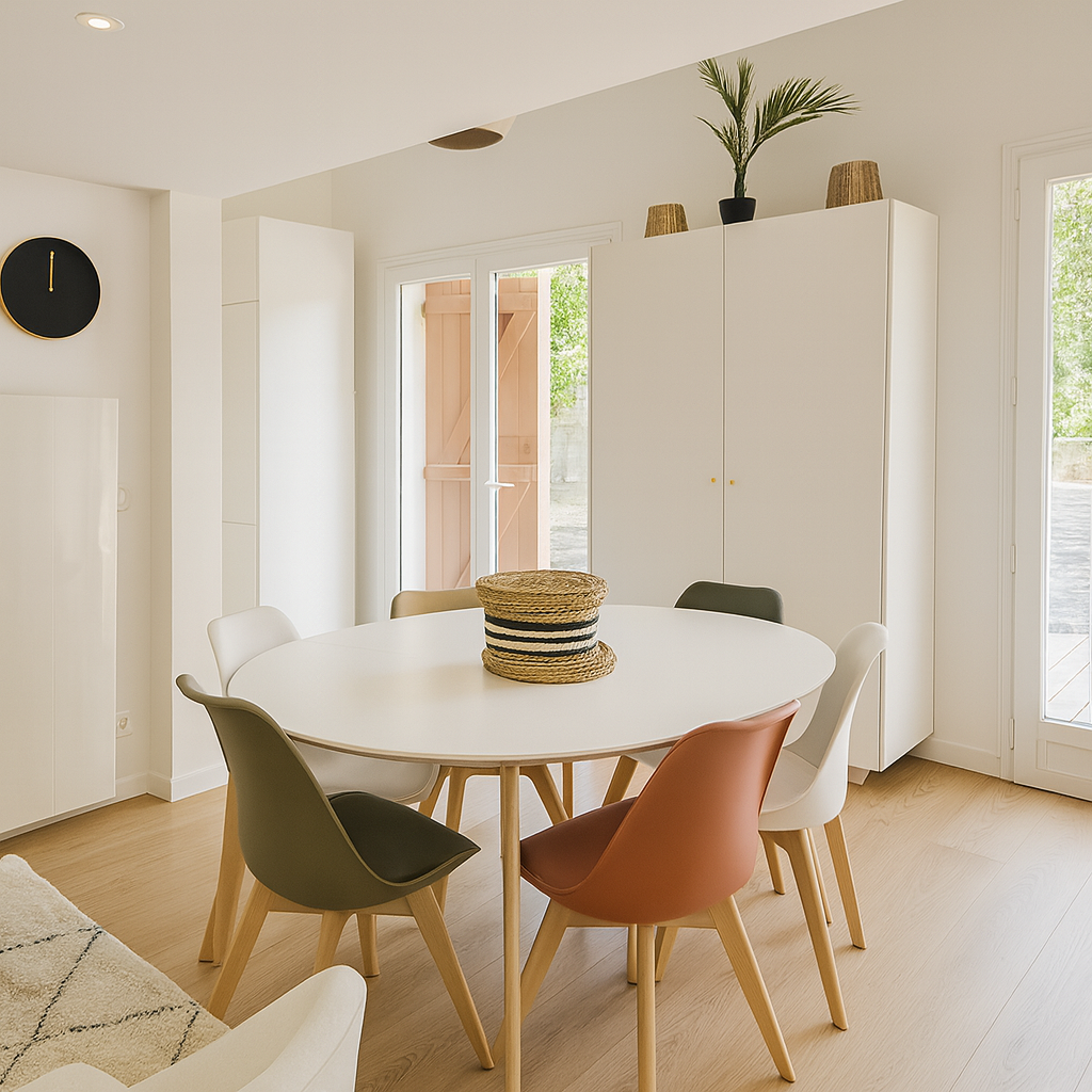 Aménagement de tout le mobilier avec un petit budget. Astuces et promotions ont permis de meubler cette jolie maison avec style.