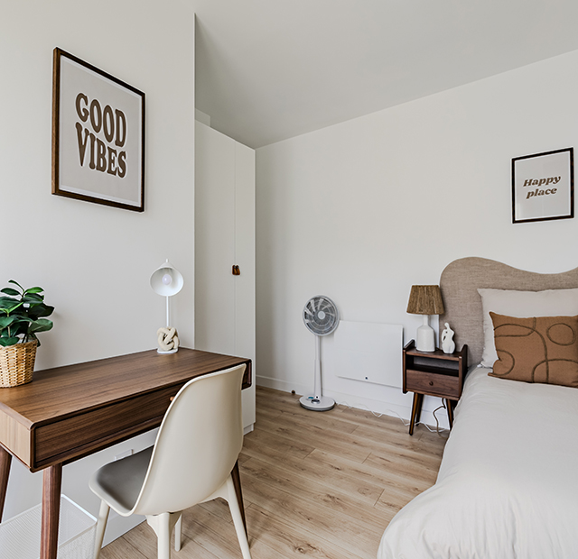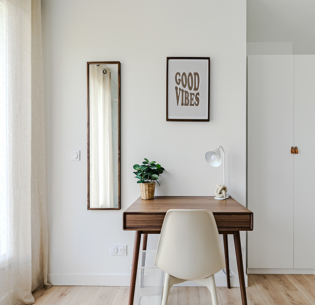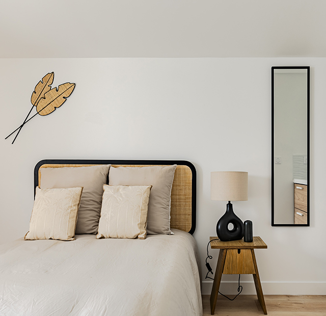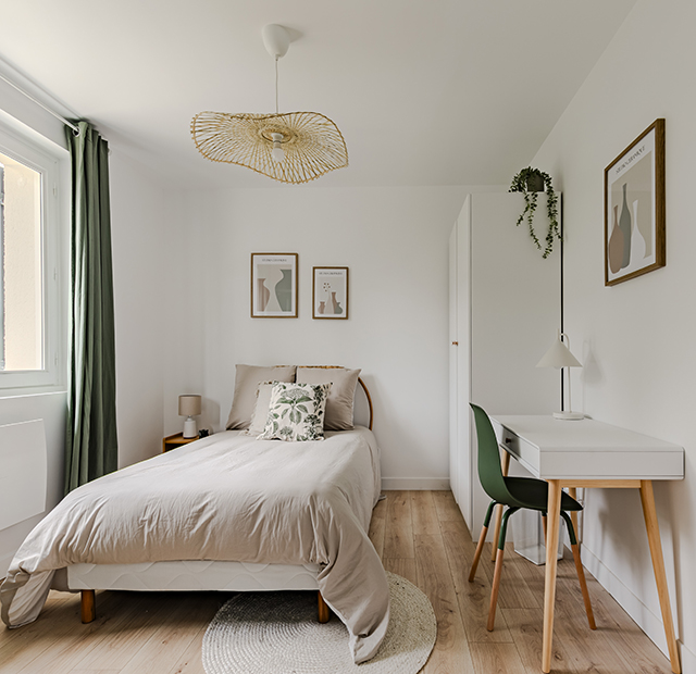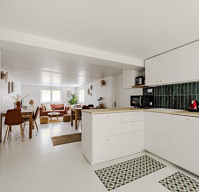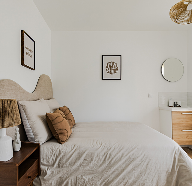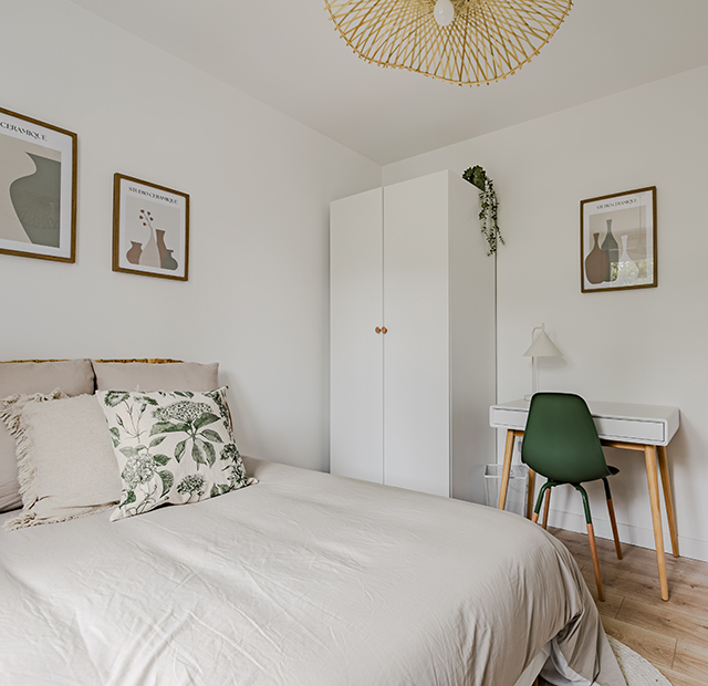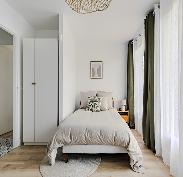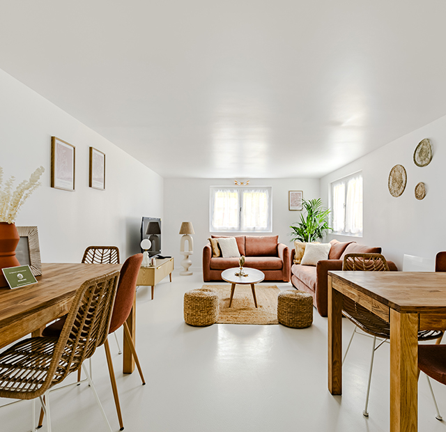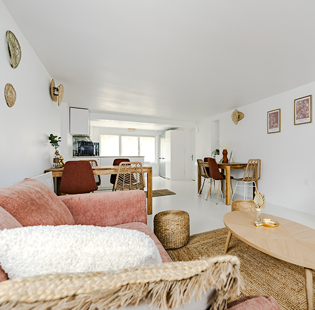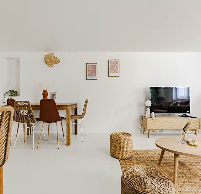 Aménagement de chambres, une grande pièce de vie dont la difficulté a été d'apporter de la lumière, créant un espace complètement blanc afin de sublimer le mobilier.